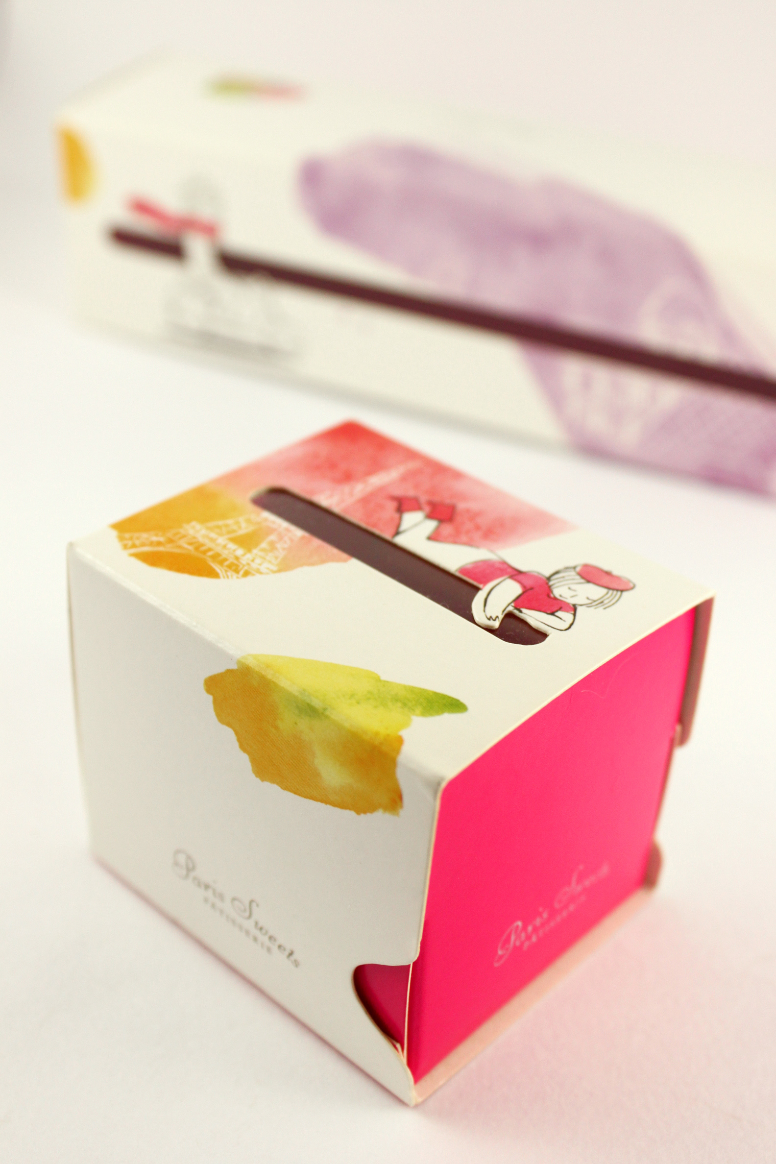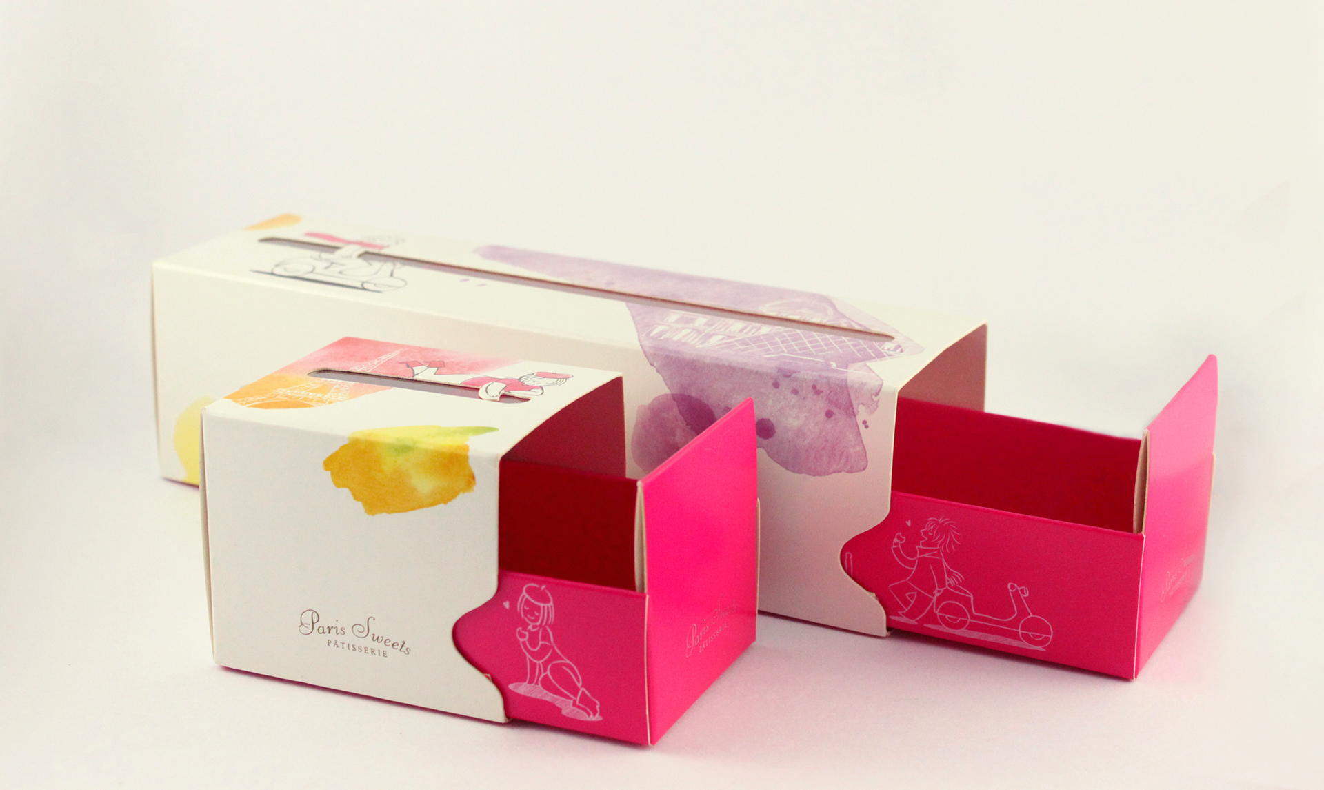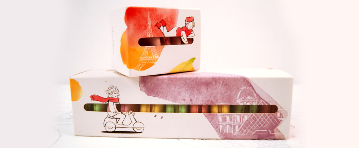 Produtos inspirados na patisserie francesa, trouxemos essa característica também para criar a identidade das embalagens, usando elementos e ícone franceses ilustrados.
